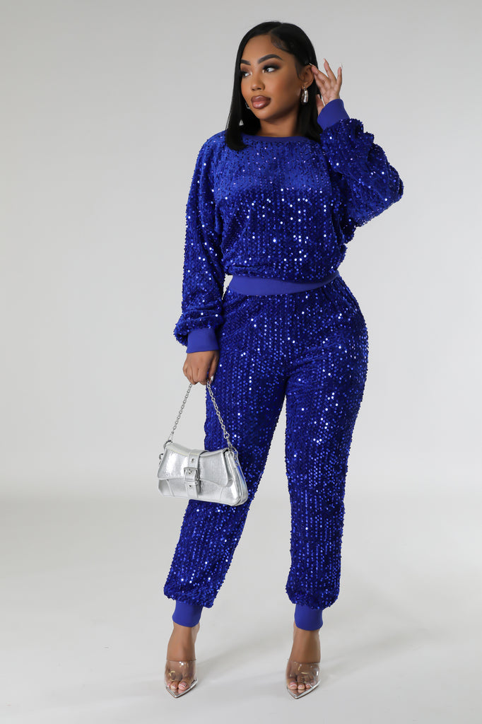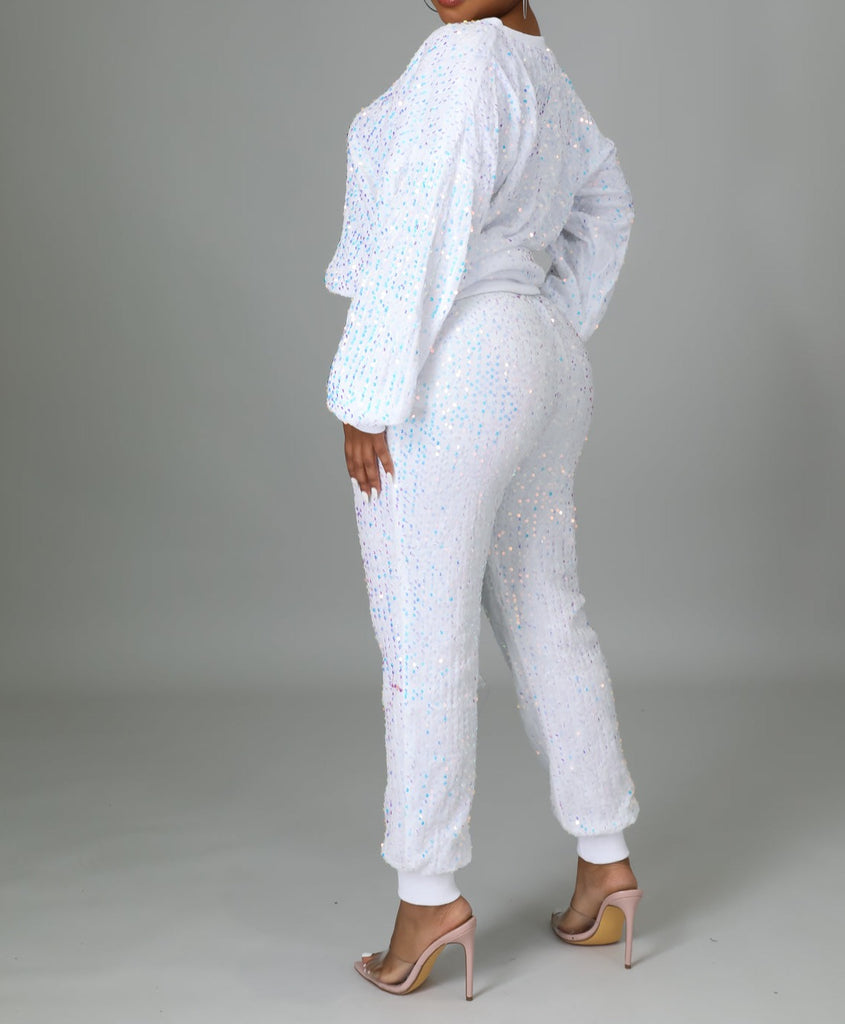 Description: Two piece jogger pants set with sequin details. Comes in Snow White or Royal Blue
