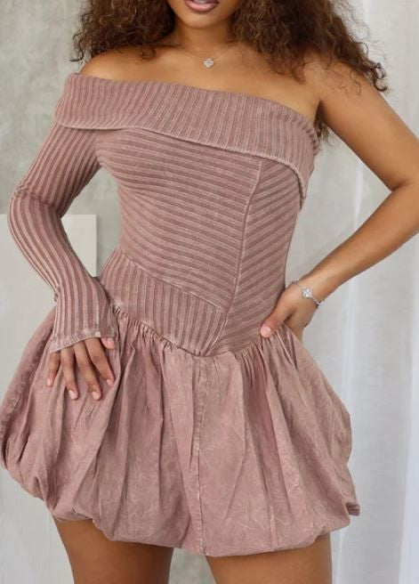 Description: Stretchy mauve one shoulder mini dress with a bubble hem